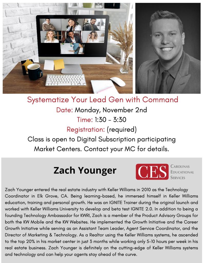 MONDAY, 11/2 – Zach Younger will be on the CES Digital Platform bringing Systematize Your Lead Gen with Command. Class starts at 1:30pm (EST). Check with your MC for registration info and save your spot today!