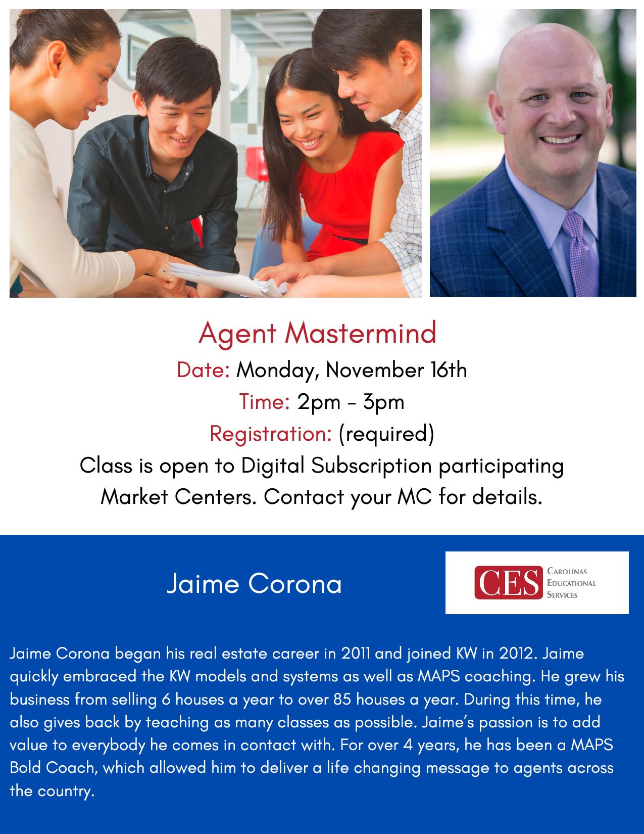 Coming Monday, November 16th – Agent Mastermind: 10-15 Leads Per Day with Jaime Corona – class starts at 2PM.