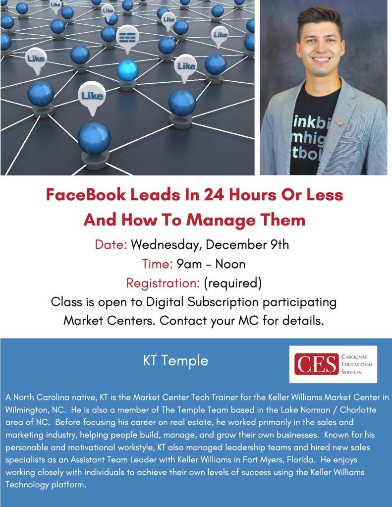Tomorrow, December 9th @ 9AM – “FaceBook Leads In 24 Hours Or Less And How to Manage Them” with KT Temple. Make sure you are registered for this one! Check with your MC for registration details and join in!