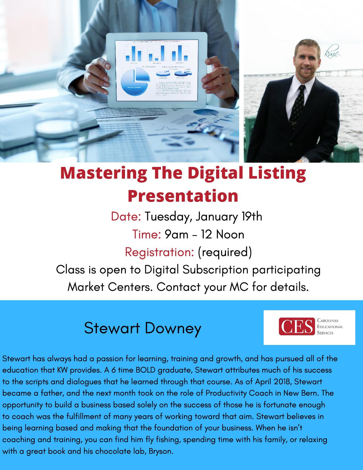 Next week – Stewart Downey is back on the CES Digital Platform with, Mastering The Digital Listing Presentation! Tuesday, January 19th at 9AM. Check with your MC for registration information and save your spot!