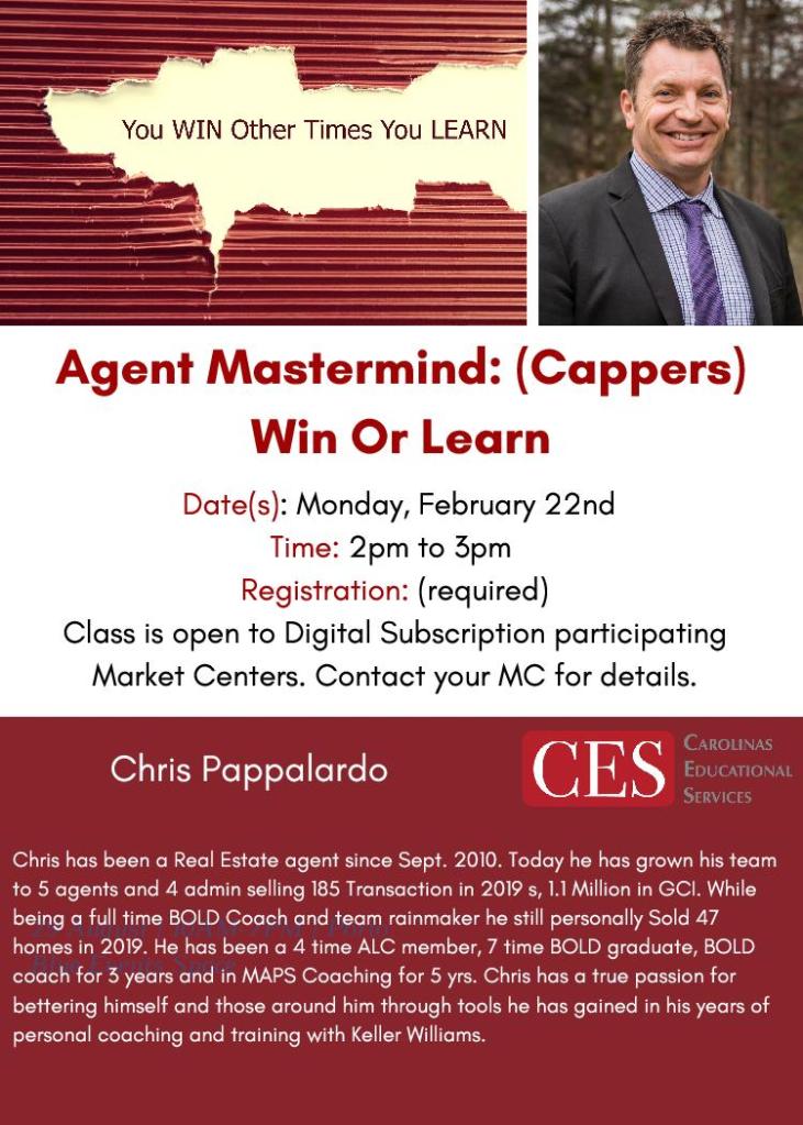 Start your week off right – Monday, February 22nd with Agent Mastermind: (Cappers) Win or Learn with Chris Pappalardo. Class starts at 2PM. Check with your MC for registration details or register from our website; http://www.carolinaces.com under the CES Digital Subscription Platform. See you there! *CES Digital classes are open only to participating market center agents.