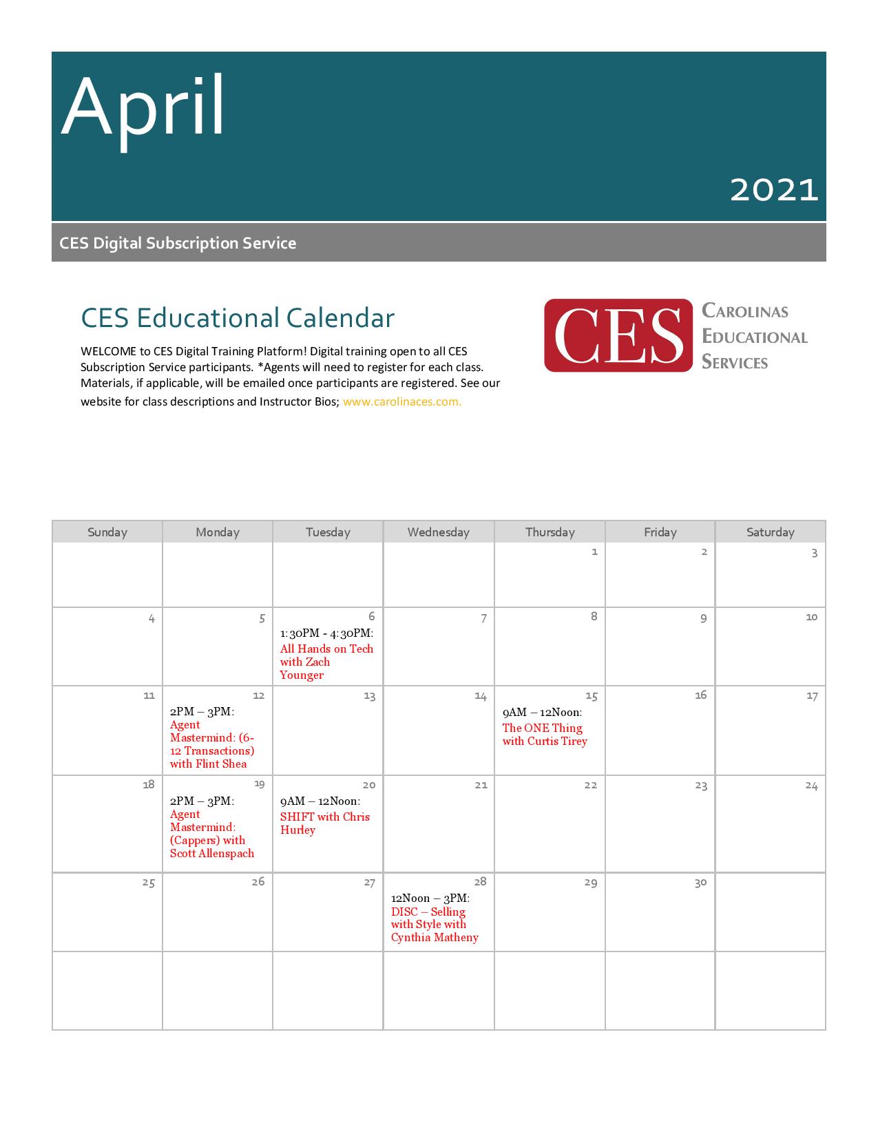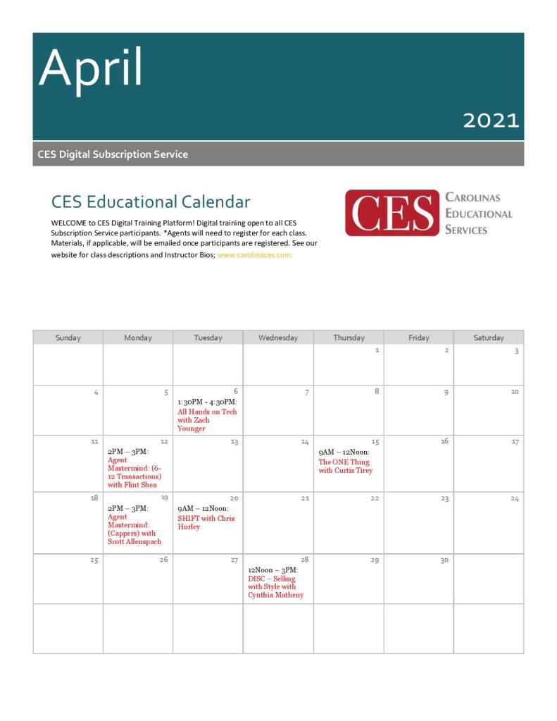 Check out our April calendar – we have some great classes coming up this month! Register today and join in! https://carolinaseducationalservices.com/ces-digital-services-platform-class-registrations-2021/