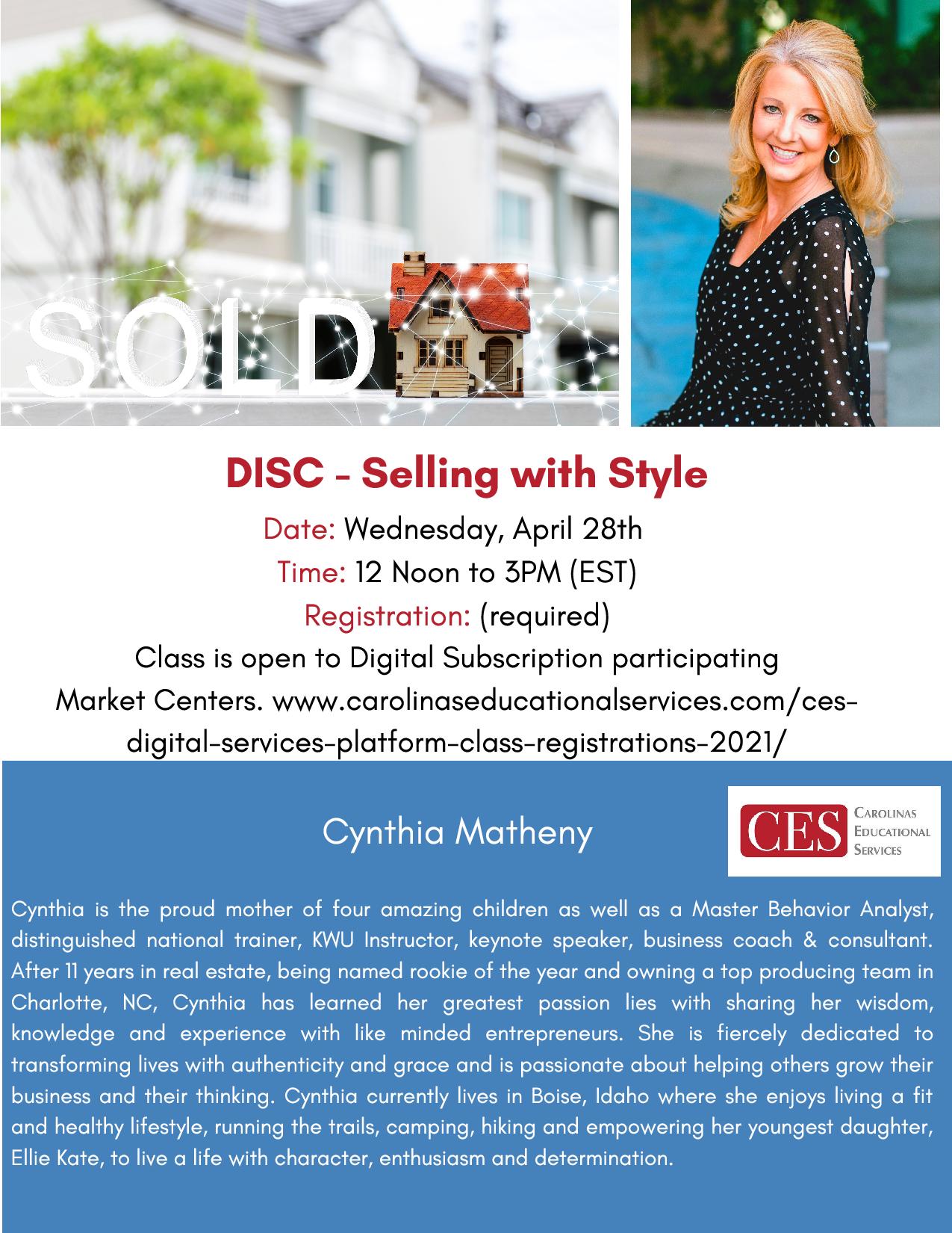 Coming this week – “DISC – Selling with Style” with Cynthia Matheny! Cynthia will be on the CES Digital Platform – Wednesday, April 28th from 12 Noon to 3PM. Check with your MC for registration details or register thru our website; https://carolinaseducationalservices.com/ces-digital…/