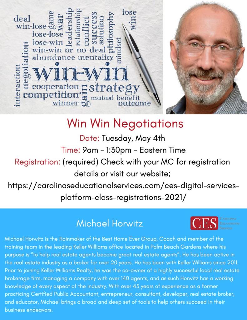 Tuesday, May 4th – Michael Horwitz will be on the CES Digital Platform with Win-Win Negotiations! You will not want to miss this one! Check with your MC for registration details or you can register thru our website; https://carolinaseducationalservices.com/ces-digital-services-platform-class-registrations-2021/