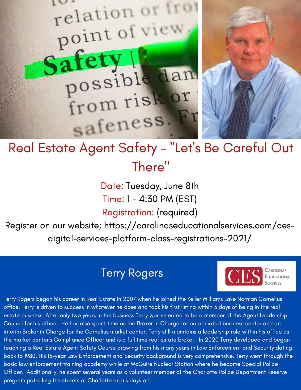 Safety is something that everyone needs to be aware of. Join Terry Rogers on the CES Digital Platform for Real Estate Agent Safety “Let’s Be Careful Out There” on Tuesday, June 8th – class starts at 1PM.