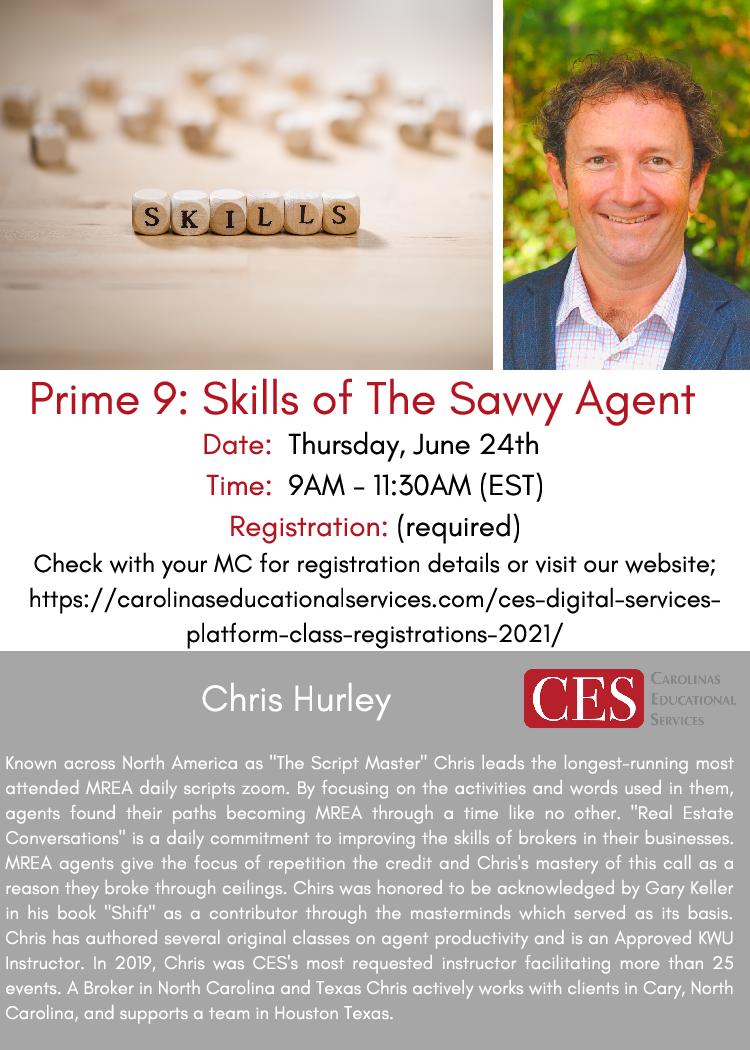 Thursday, June 24th – Chris Hurley will be bringing Prime 9: Skills of the Savvy Agent. (9AM-11:30AM)