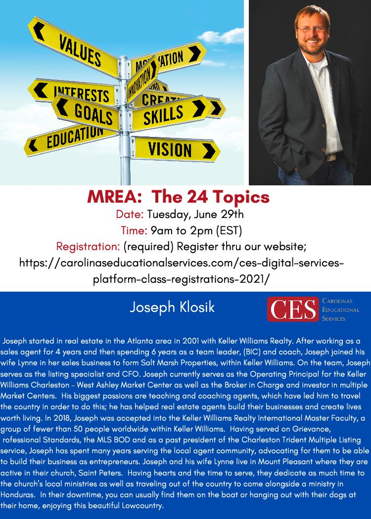 Next week on the CES Digital Platform; MREA: The 24 Topics with Joseph Klosik – Tuesday, June 29th at 9AM (EST). Check with your MC for registration details or you can register thru our website;