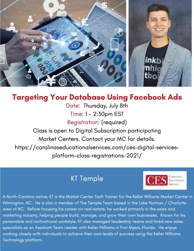 Targeting Your Database Using Facebook Ads with KT Temple – starts NOW! You still have time to register – visit our website; https://carolinaseducationalservices.com/ces-digital…/