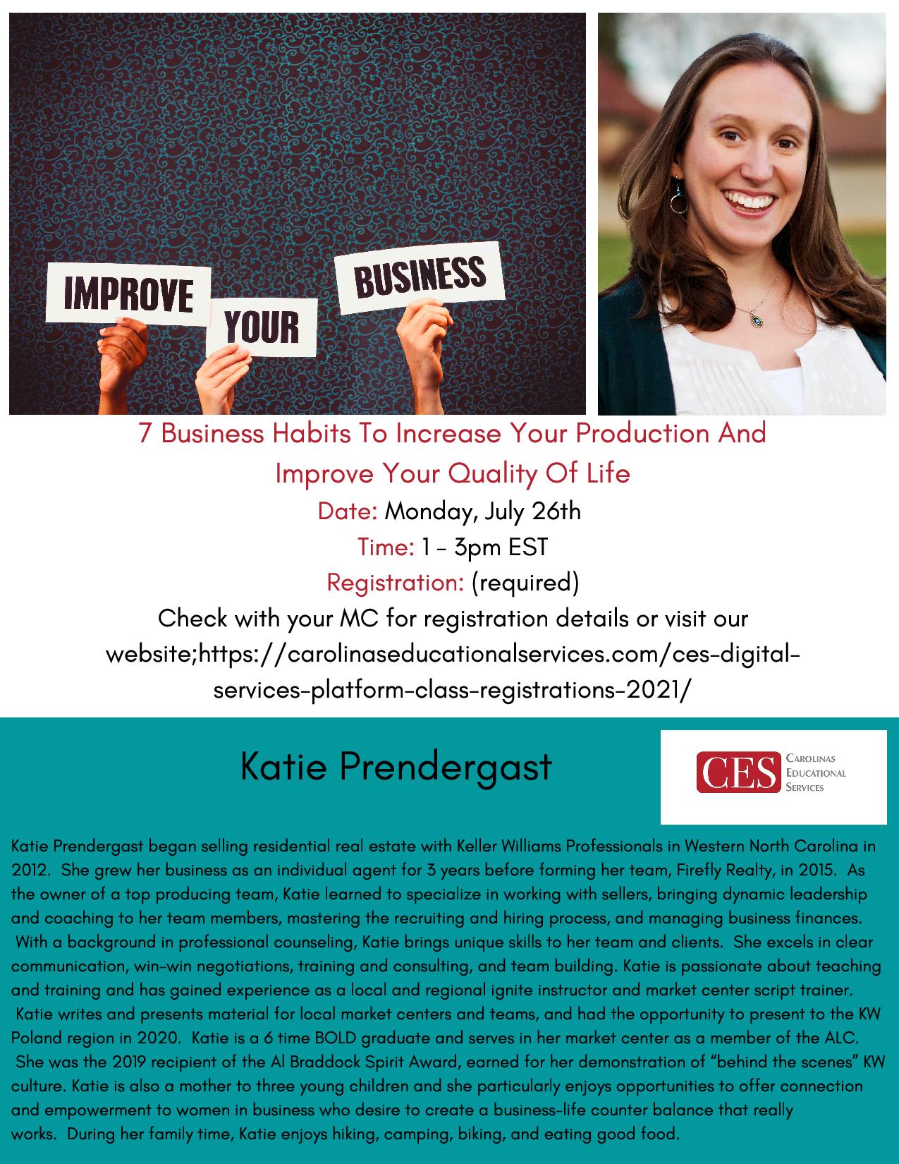 You won’t want to miss Katie Prendergast and 7 Business Habits That Increase Production and Improve Your Quality of Life – TODAY (July 26th) on the CES Digital Platform. Class starts at 1PM (EST).