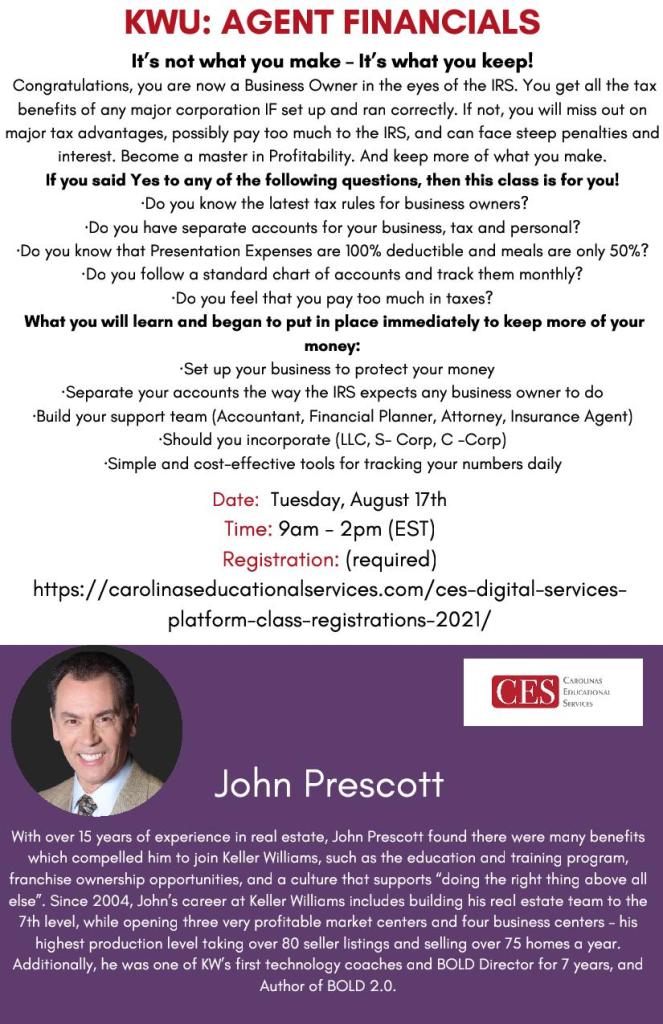 Is your business profitability important to you? John Prescott will be on the CES Digital Platform on Tuesday, August 17th with Profitability: Agent Financials – DO NOT MISS this class! John will share his knowledge and experience from his 15+ year career!