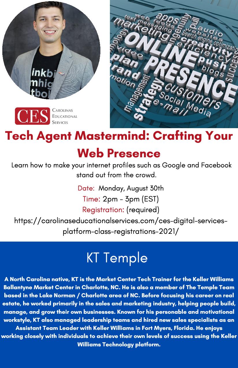 Monday, August 30th join KT Temple on the CES Digital Platform with Tech Agent Mastermind: Crafting Your Web Presence – class starts at 2PM.