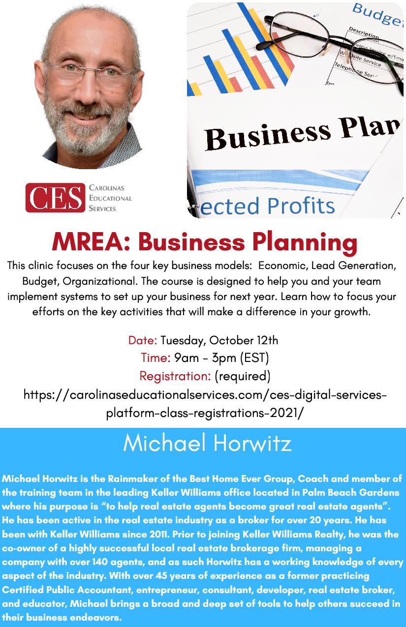Join Michael Horwitz on Tuesday, October 12th for MREA: Business Planning.