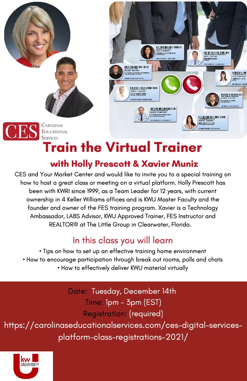 Tomorrow (12/14) on the CES Digital Platform – Train the Virtual Trainer with Holly Prescott and Xavier Muniz! Class starts at 1pm (EST).