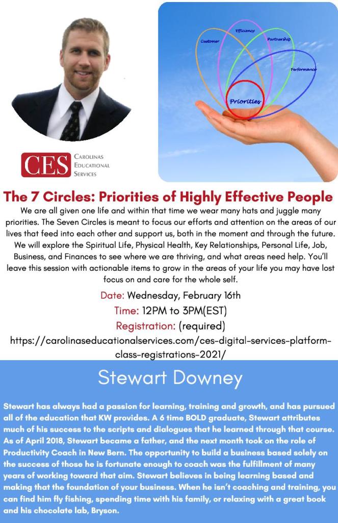 Next week on the CES Digital Platform; The 7 Circles: Priorities of Highly Effective People with Stewart Downey! Class starts at 12Noon!