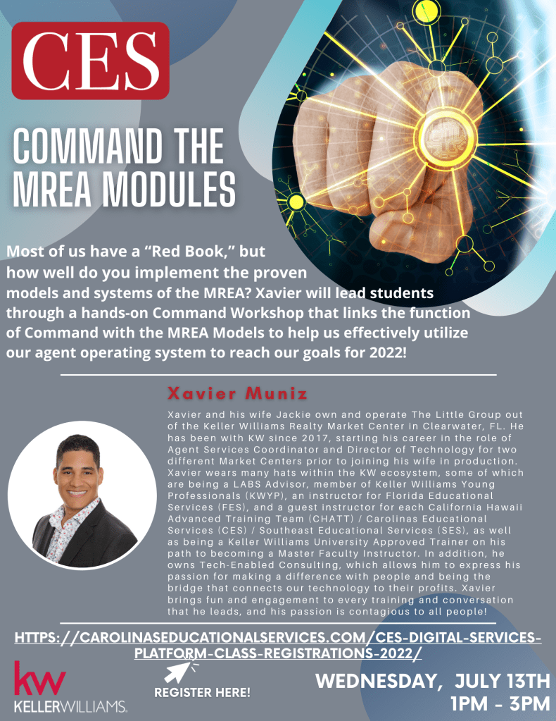 Most of us have a “Red Book,” but how well do you implement the proven models and systems of the MREA? Xavier will lead students through a hands-on Command Workshop that links the function of Command with the MREA Models to help us effectively utilize our agent operating system to reach our goals for 2022!