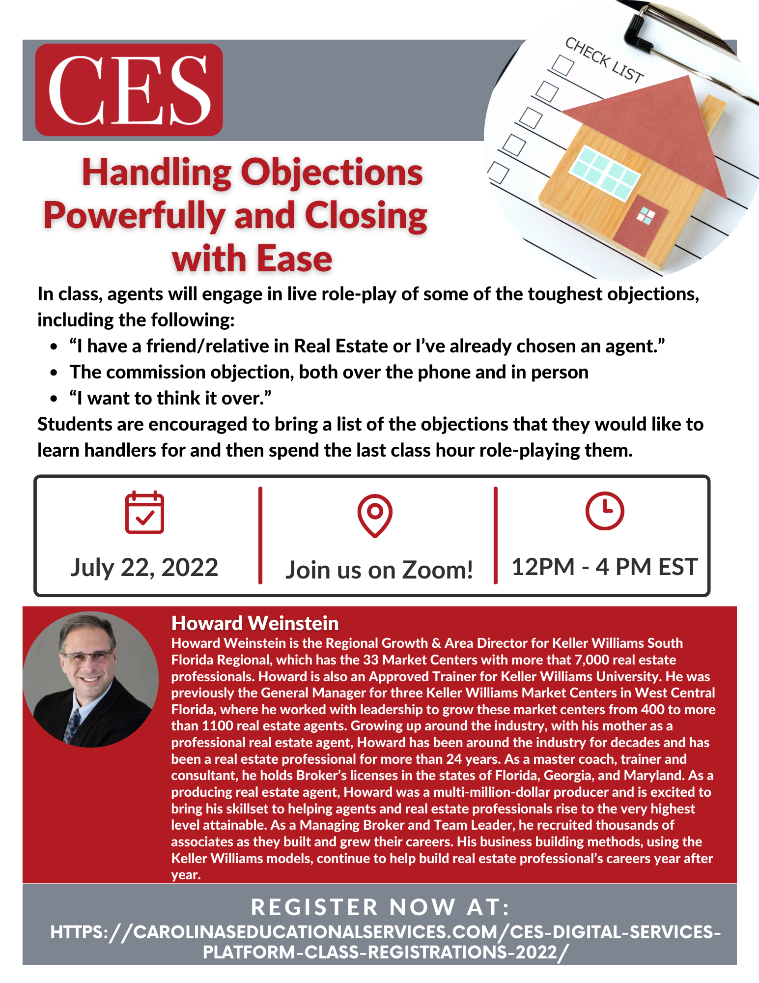 Handling Objections Powerfully and Closing with Ease with Howard Weinstein on Friday, July 22nd at 12PM (EST).