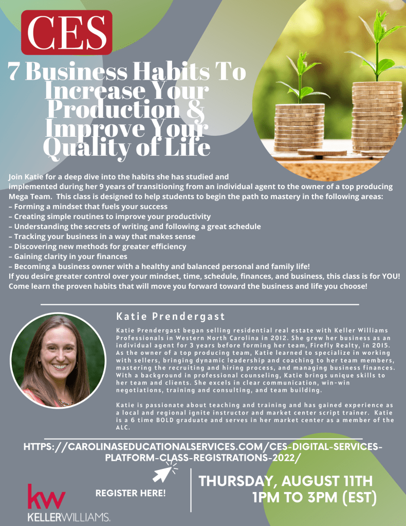 Coming Thursday, August 11th at 1PM (EST) – join Katie Prendergast from Firefly Realty at the KW Asheville MC with 7 Business Habits to Increase Your Production and Improve Your Quality of life! Katie is the owner of Firefly Realty in Asheville, NC. Join her as she shares her amazing class and discusses how she built her business!
