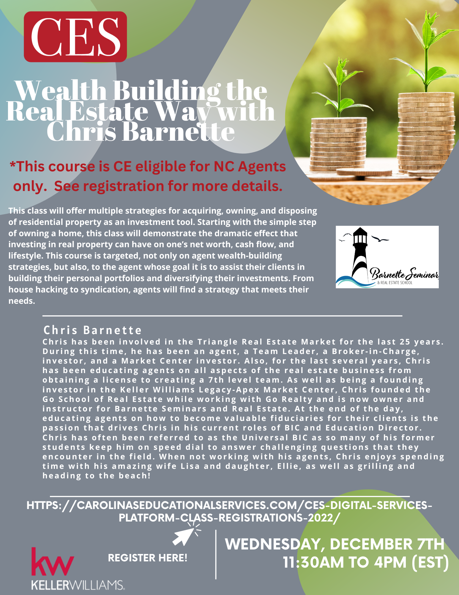 Join Chris Barnette on the CES Digital Platform – tomorrow, Wednesday, December 7th for Wealth Building the Real Estate Way! Class starts at 11:30AM (EST).