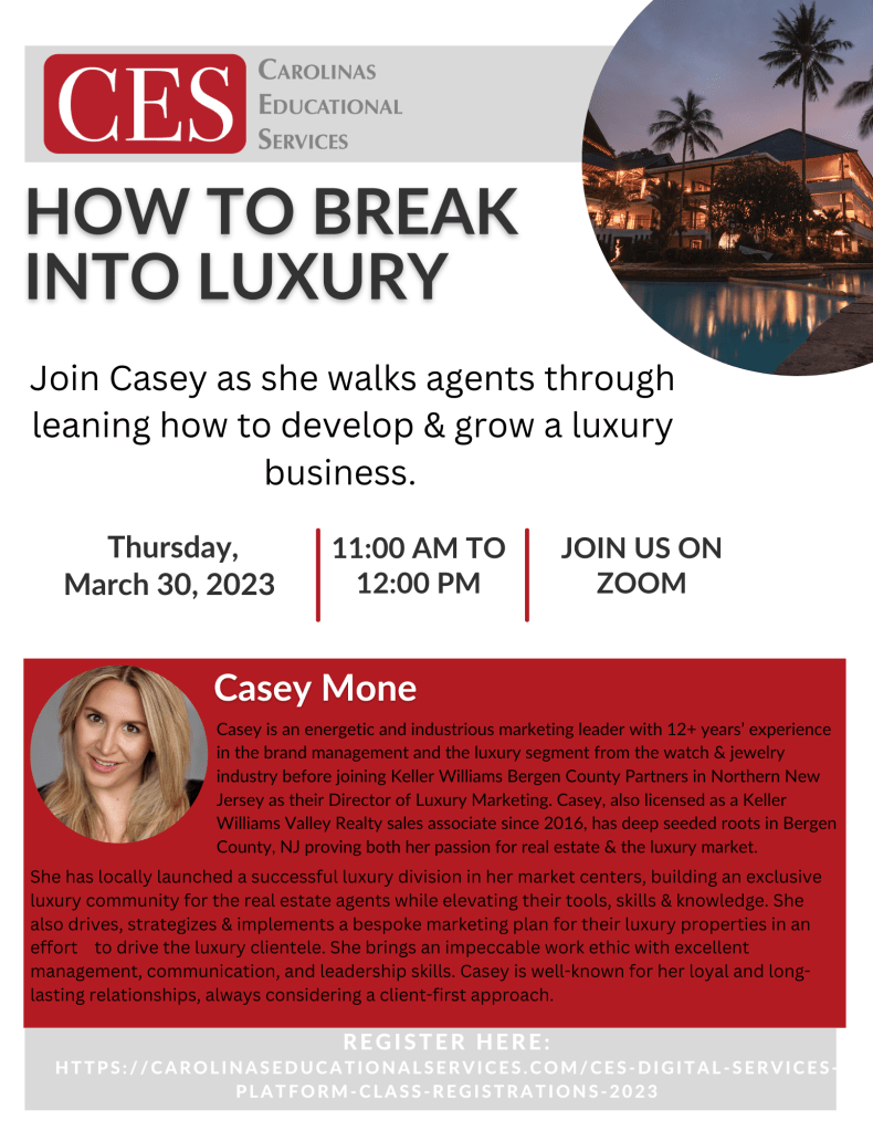 Interest in breaking into the luxury market? Join us next week on the CES Digital Platform. We have Casey Mone joining us with How to Break into Luxury! Class starts at 11AM (EST).