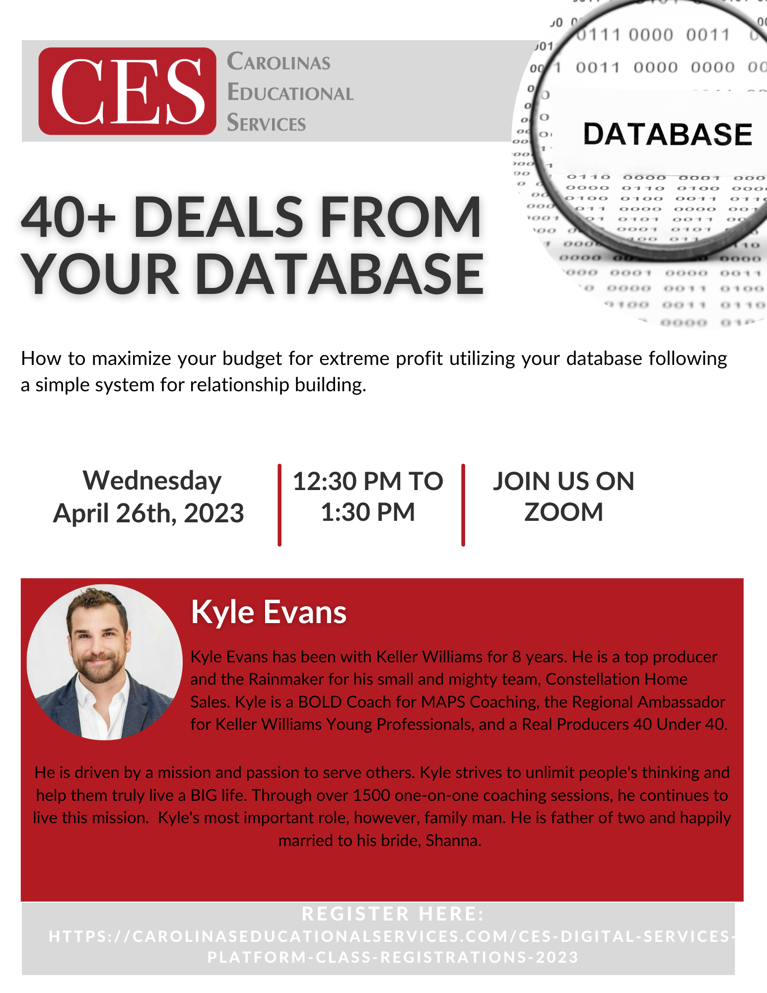 Join Kyle Evans for 40+ Deals from Your Database on Wednesday, April 26th at 12:30PM (EST).