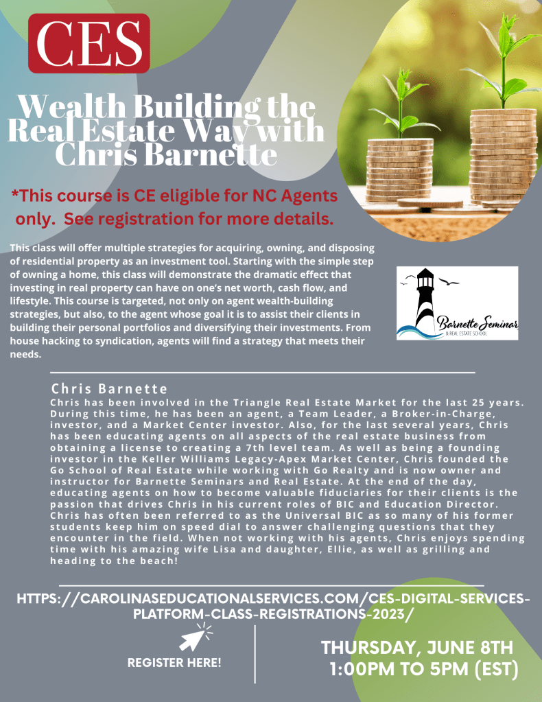 If you are down to the wire to get your CE completed – we have got you covered! We have GENUP with Chris Barnette on 6/6 and CE Elective – Wealth Building the Real Estate Way with Chris Barnette on 6/8.
