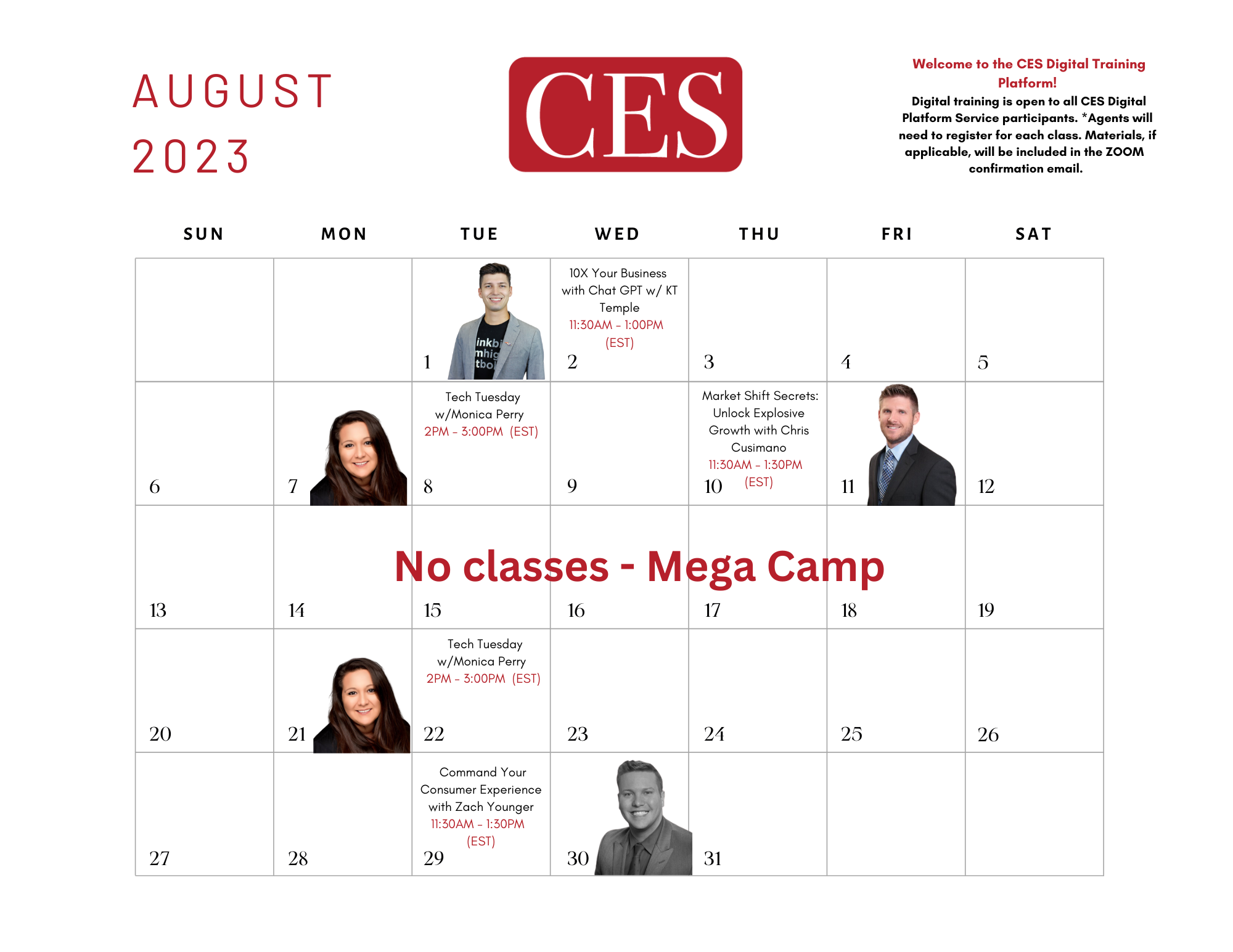 Did you miss 10X Your Business with Chat GPT with KT Temple last week? We have another chance for you coming in August! Along with several other amazing classes you don’t want to miss out on. Tech Tuesday with Monica Perry, Market Shift Secrets with Chris Cusimano and Command Your Consumer Experience with Zach Younger!