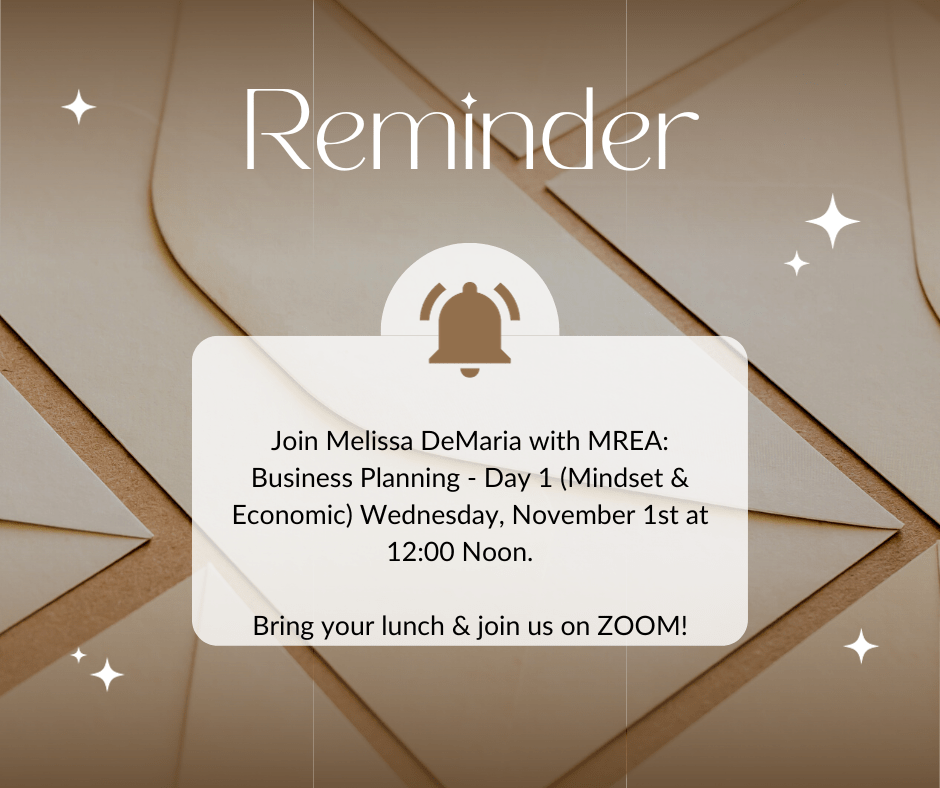 Tomorrow, Wednesday November 1st on the CES Digtial Platform – MREA Business Planning: Day 1 – Mindset & Economic with Melissa DeMaria! Class starts at 12 Noon. Bring your lunch and join us!
