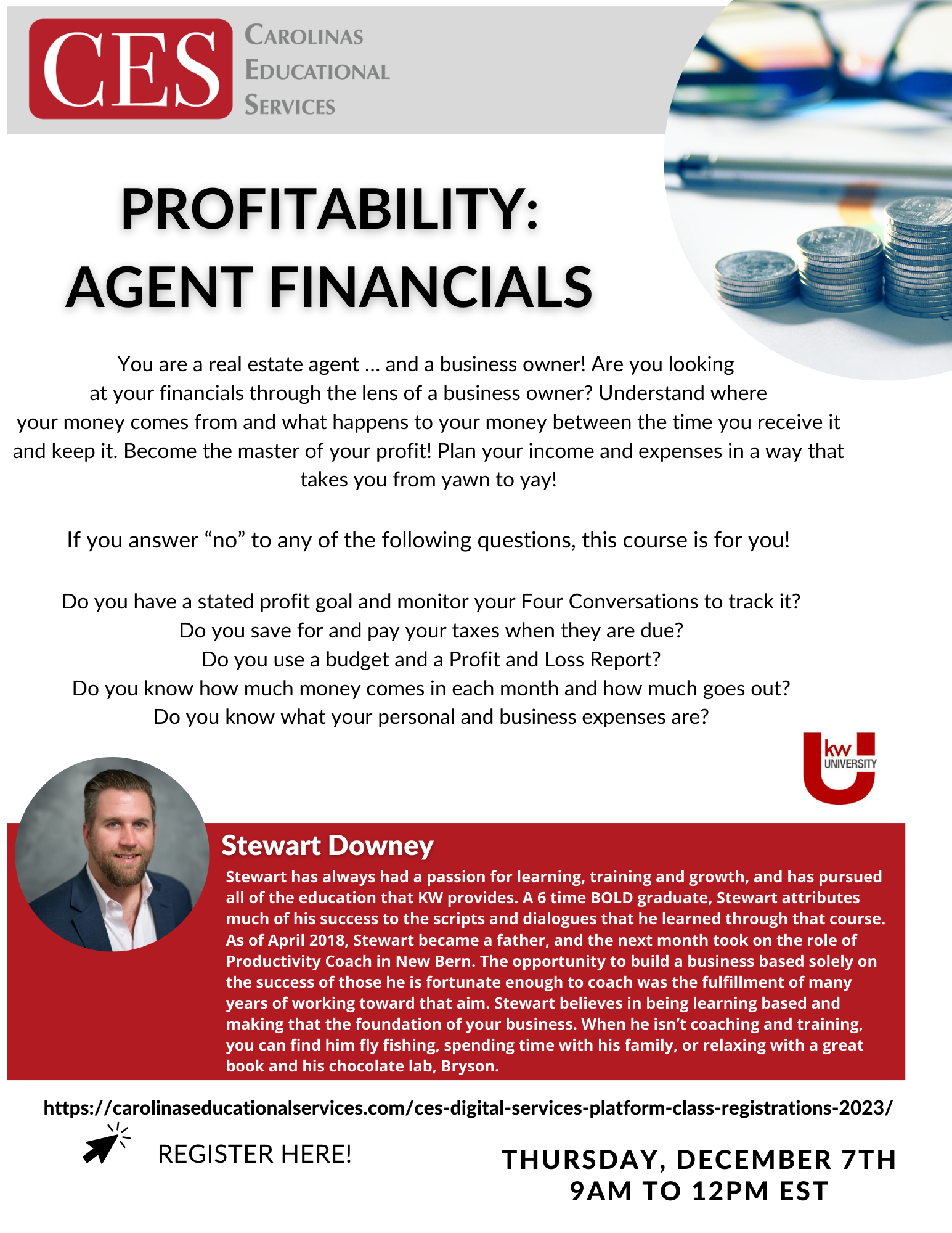 Coming to the CES Digital Platform on Thursday, December 7th – ProfitAbility: Agent Financials with Stewart Downey! Class starts at 9AM.