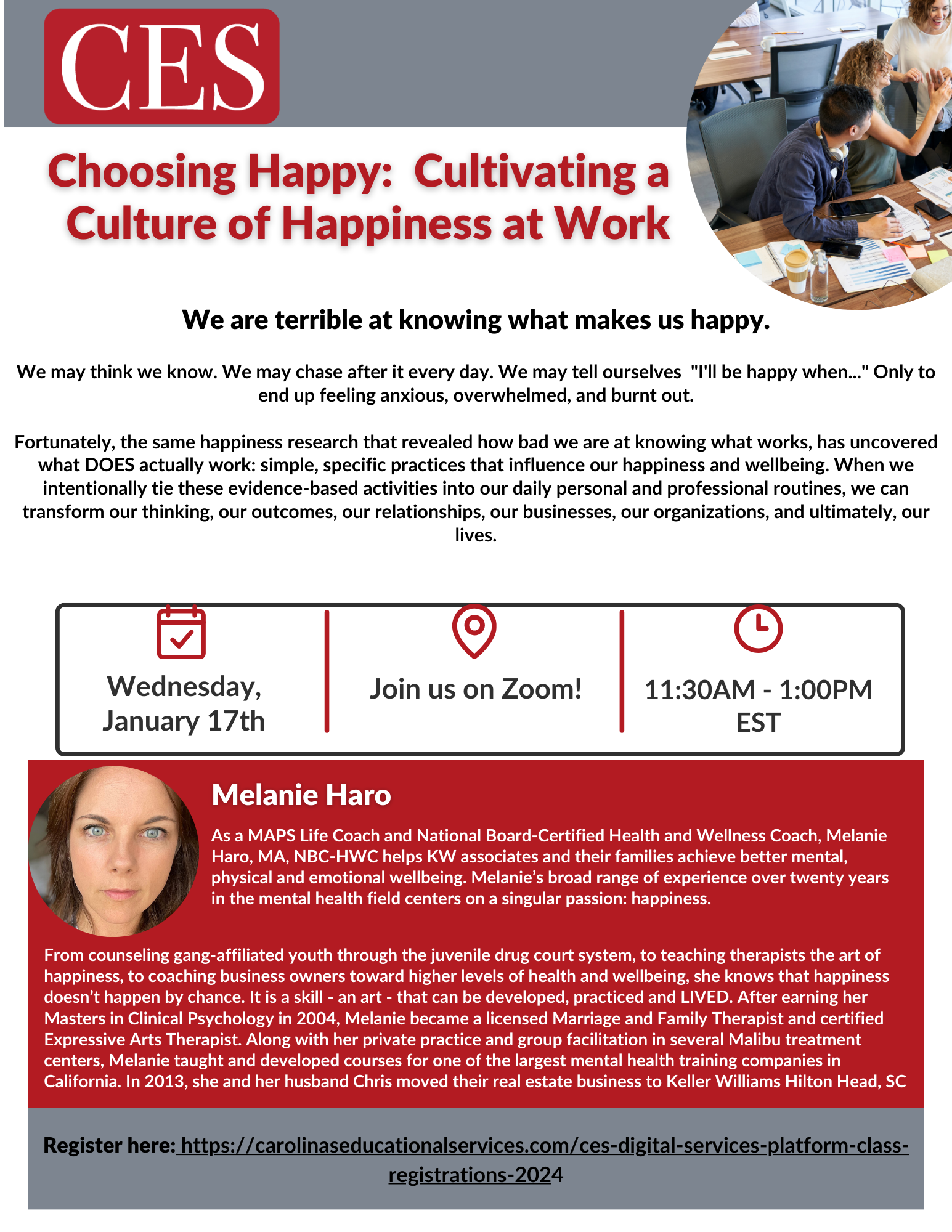 Join Melanie Haro on Wednesday, January 17th for Choosing Happy: Cultivating a Culture of Happiness at Work!