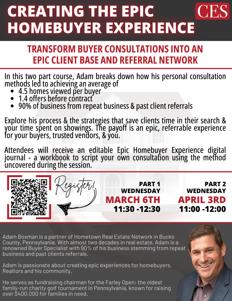 Attendees will receive an editable Epic Homebuyer Experience digital journal – a workbook to script your own consultation using the method uncovered during the session.