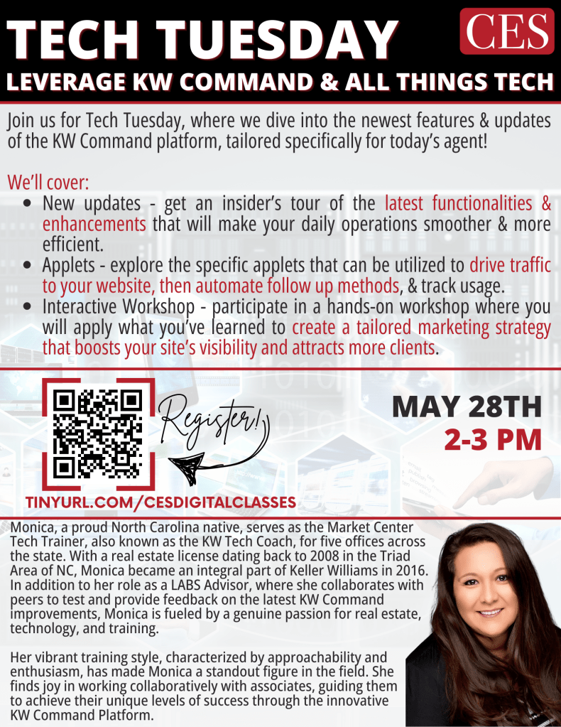 Join us for Tech Tuesday, with Monica Perry, where we delve into the newest features and updates of the KW Command platform, tailored specifically for today’s real estate agent! This class is designed to not only familiarize you with the cutting-edge updates but also equip you with the skills to harness AI and applets within Command to enhance your website’s traffic and engagement.
