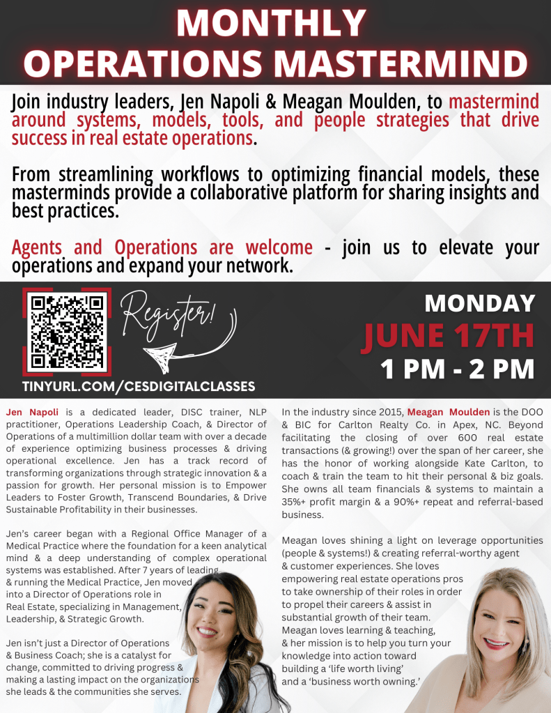 Join industry leaders, Jen Napoli & Meagan Moulden, to mastermind around the systems, models, tools, and people strategies that drive success in real estate operations.