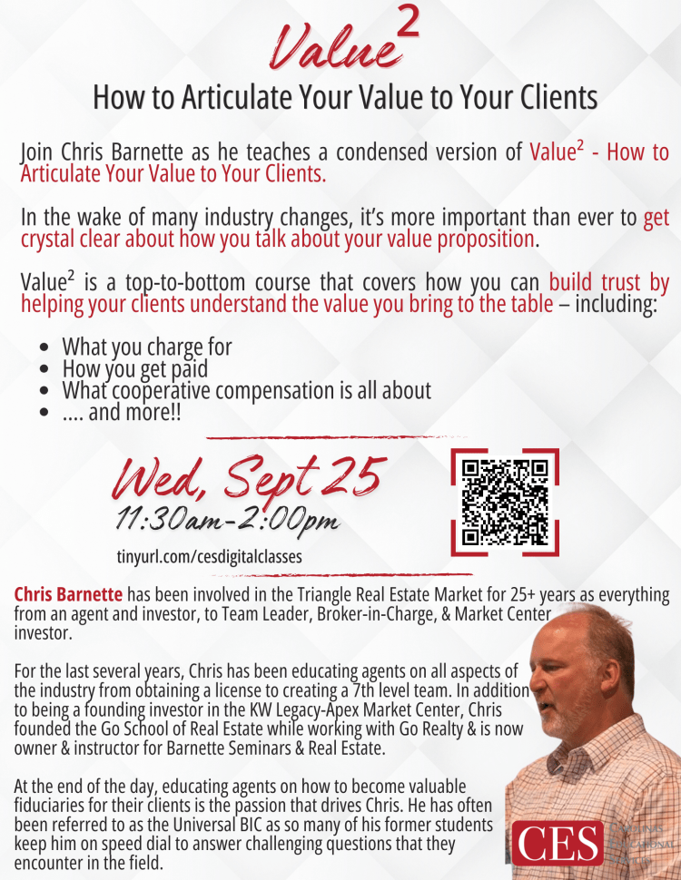 Join industry leader, Chris Barnette of CES and Barnette Seminars, to craft your unique value proposition and ensure you can convey the value you bring to the table to take more market share.