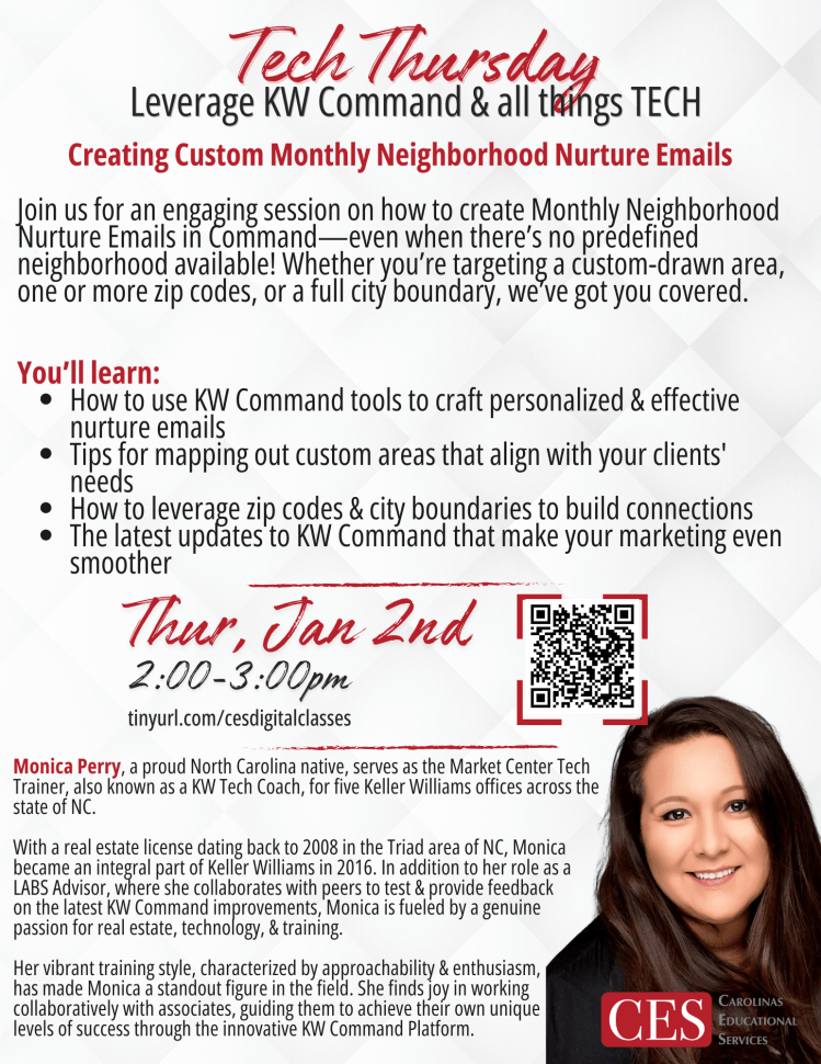 Join KW Tech Trainer, Monica Perry for an engaging session on how to create Monthly Neighborhood Nurture Emails in Keller Williams Command—even when there’s no predefined neighborhood available!