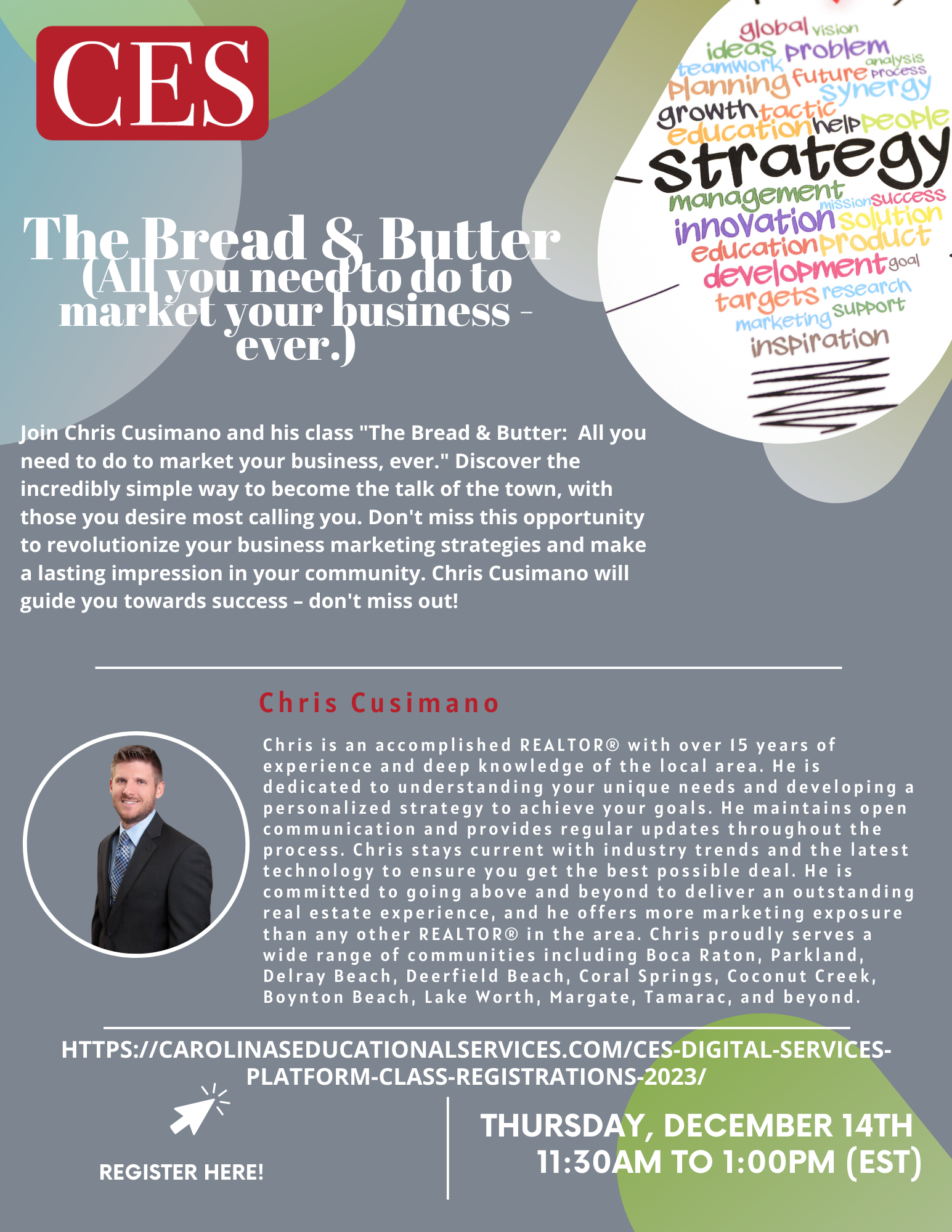 Join Chris Cusimano in his class “Lead Magnet Mastery for Realtors.” In today’s competitive market, every business uses lead magnets to their advantage. This class will empower you with the knowledge and tools to effectively leverage these simple yet powerful resources in your daily marketing efforts. Learn how to attract more potential clients and make them come to you. Don’t miss this opportunity to take your real estate business to the next level with Lead Magnet Mastery!