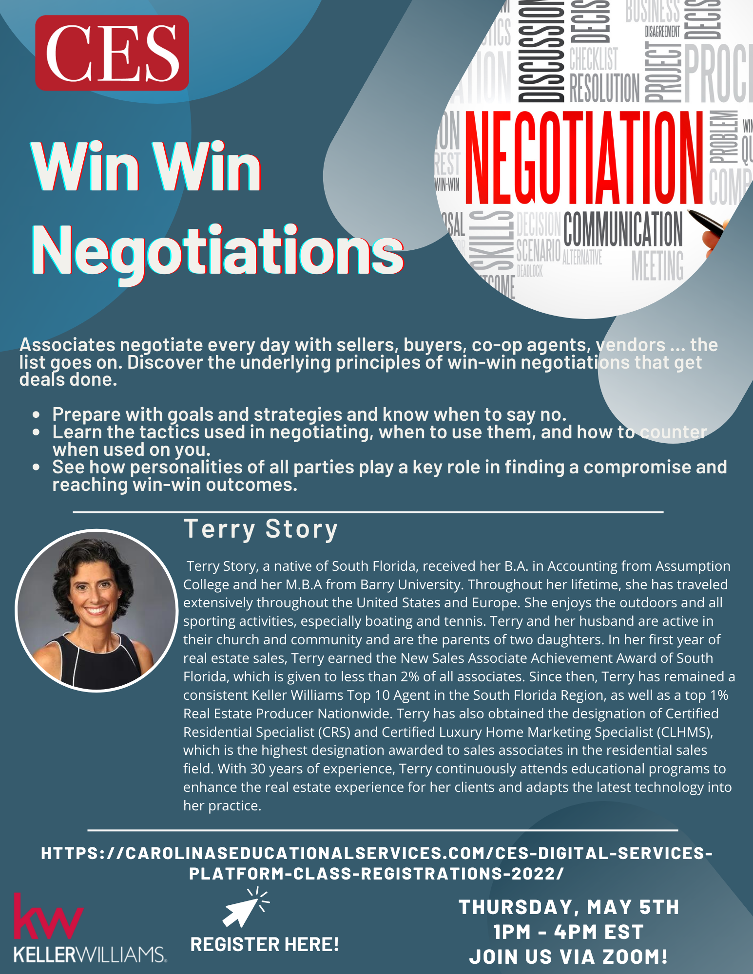 Then join us on Thursday, May 5th for Win Win Negotiations with Terry Story, class starts at 1PM (EST). Associates negotiate every day with sellers, buyers, co-op agents, vendors … the list goes on. Discover the underlying principles of win-win negotiations that get deals done.